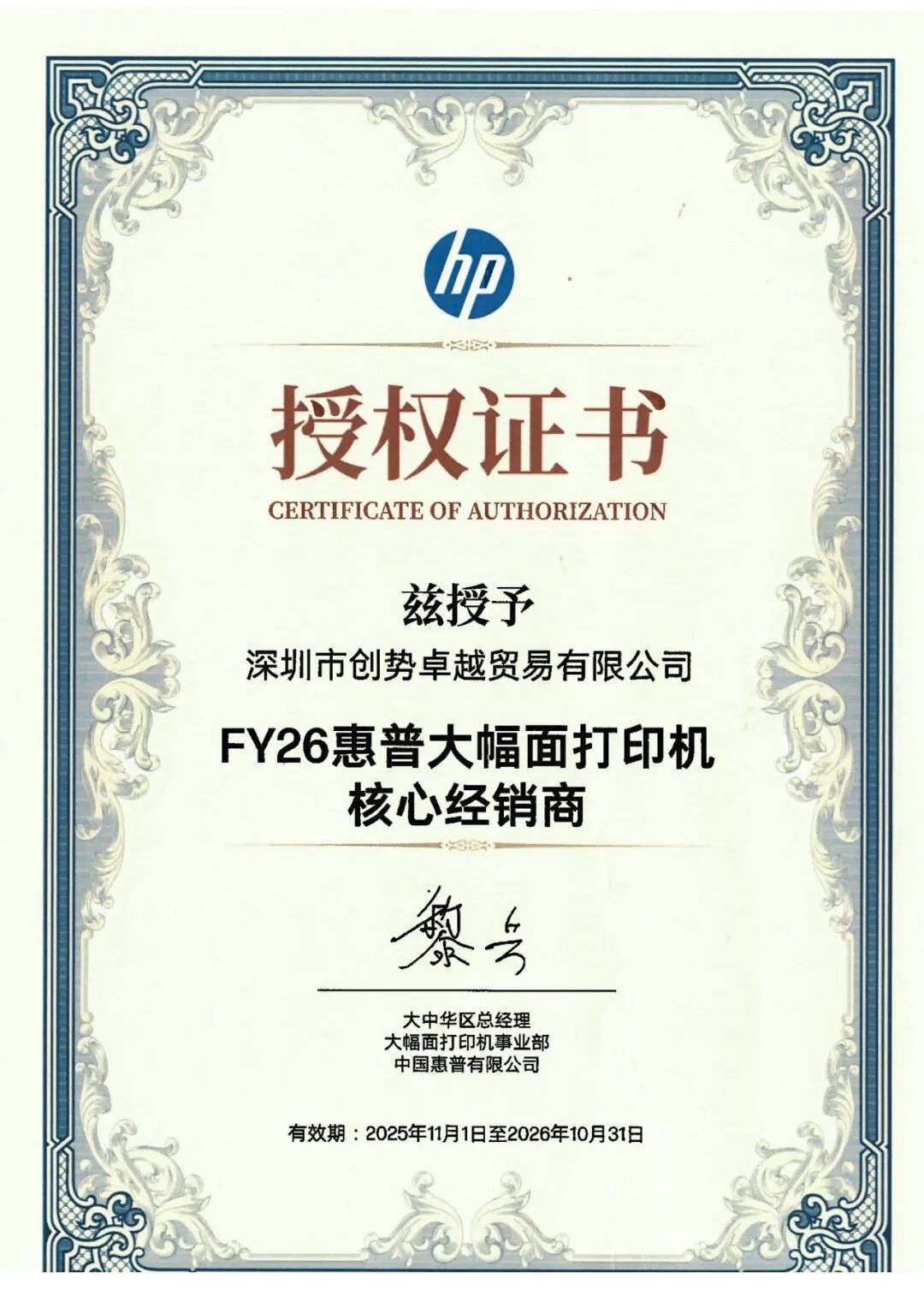 大会期间,惠普也对各省表现卓越的代理商进行了表彰,并正式颁发了新一年度的代理证书。我司再次荣获「惠普大幅面打印机核心代理」资质。这份荣誉,既是对我们过去努力的肯定,更是对未来发展的期许。